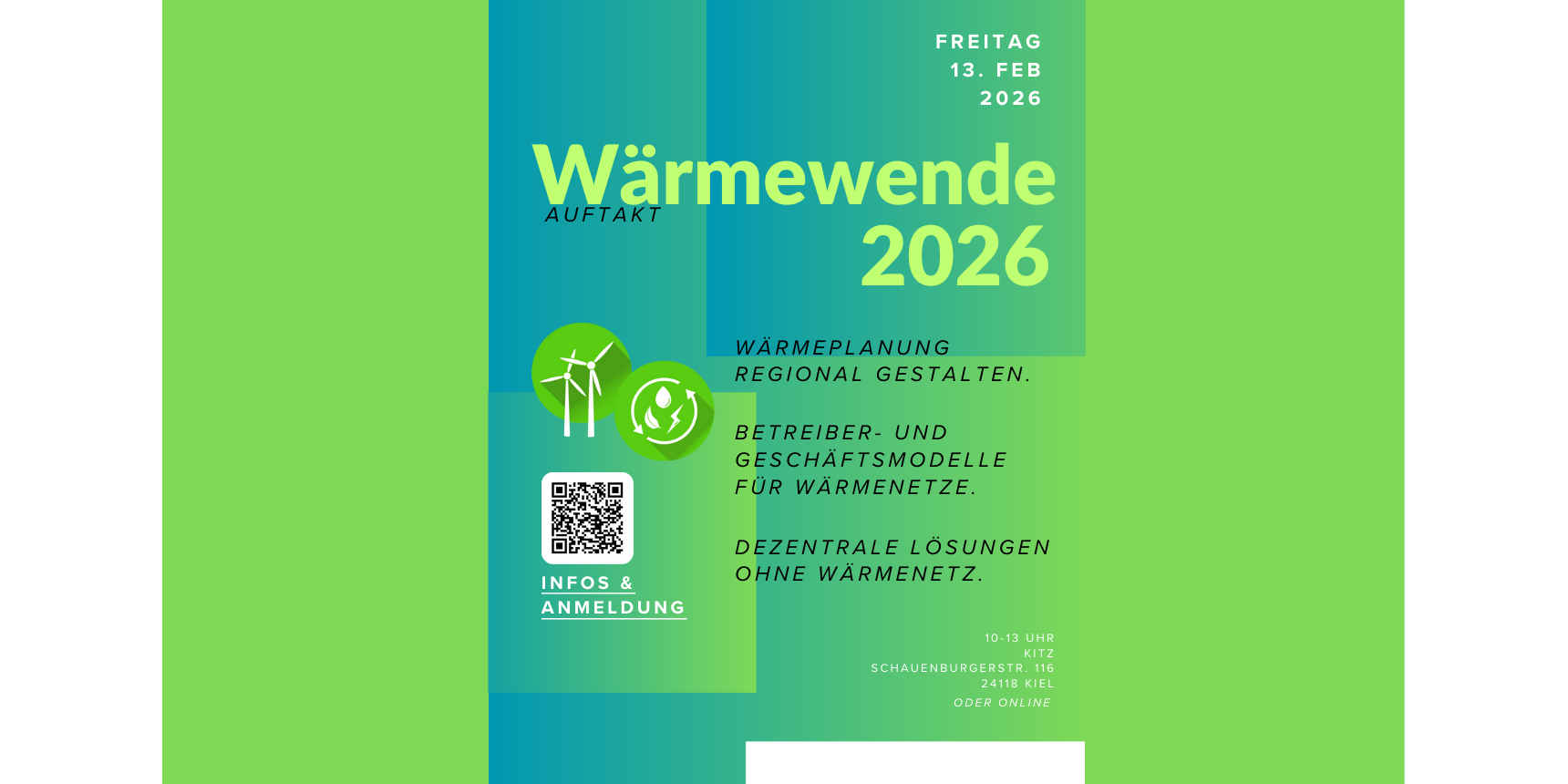 Wie gelingt der Übergang zu einer bezahlbaren, nachhaltigen und regionalen Wärmeversorgung? Darum geht es beim Auftakt „Wärmewende 2026“ am Freitag, den 13. Februar 2026, von 10 bis 13Uhr im KITZ in Kiel. Die plan[neo] GmbH und der Wirtschafsrat Recht laden Kommunen und kommunale Akteure herzlich ein, konkrete Wege von der Planung in die Umsetzung zu diskutieren. Gemeinsam vor Ort oder auch online. Die Teilnahme ist kostenfrei.